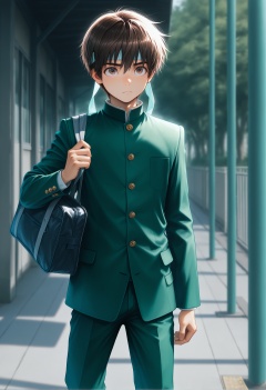 masterpiece,best quality,amazing quality,very aesthetic,absurdres,newest, mamoru,1boy,male focus,solo,brown eyes,brown hair,short hair,headband,raimon,school uniform,gakuran,jacket,green jacket,buttons,long sleeves,buttons,pants,green pants,bag,school bag, outdoor,
