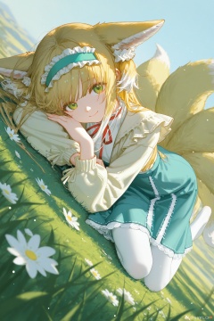 masterpiece,best quality,amazing quality,very aesthetic,absurdres,newest,scenery,1girl,suzuran \(spring praise\) \(arknights\),(ningen mame:1.1),ciloranko,[sho \(sho lwlw\)],ask \(askzy\),tianliang duohe fangdongye,rhasta,wlop,dynamic angle,dutch angle,on stomach,head tilt,head rest,animal ears,blonde hair,eyes visible through hair,frilled hairband,frilled skirt,grass,green eyes,green hairband,legs up,long hair,long sleeves,looking at viewer,lying,multicolored hair,multiple tails,neck ribbon,official alternate costume,outdoors,plant,red ribbon,ribbon-trimmed skirt,smile,solo,streaked hair,white flower,white pantyhose,white tail,yellow tail,light particles,bloom,depth of field,masterpiece,best quality,good quality,newest,highres,absurdres,