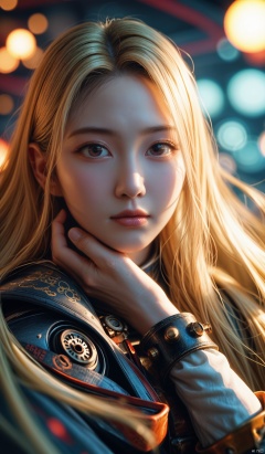 front view, portrait, reij-cybersteam, steampunk, asian, cyberfuturistic, futuristic steampunk, robotic elegance, mechanical aesthetic, cyberdoll details, dim lighting, bokeh effect, asian architecture , a woman, blonde hair, very long hair, lying, moonlight, hand on chin, looking at viewer, dynamic motion,score_9_up score_8_up score_7_up,HANFU,COLORFUL GRADIENT