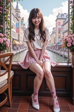 A photorealistic masterpiece of a confident and lively Asian girl with long hair, stunning features, and captivating eyes. She's posed looking away from the viewer, exuding an air of quiet confidence. Framed by a magnificent cityscape, she sits in a cozy cafe, surrounded by the bustling atmosphere. Her pleated skirt falls just above her knees, showcasing her toned legs clad in pink tights and floral patterned ones. White high heels add a touch of elegance to her overall look. The focus is from below, emphasizing the subject's beauty as she effortlessly blends into the romantic cityscape.,HARUKA,AIDMAFLUXPROULTRA,AIDMAHYPERREALISM