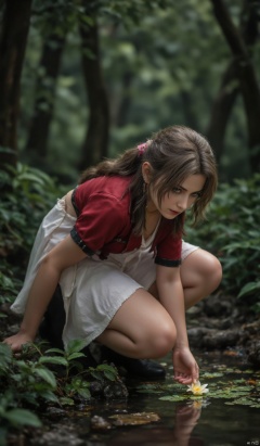 A professional photograph of Aerith Gainsborough crouching by a stream in a dense forest. She’s leaning forward, peering intently at a small flower blooming on the edge of the water. Her fingers reach toward it, her expression a mix of curiosity and quiet admiration.,Aerith Gainsborough,,AIDMAFLUXPROULTRA