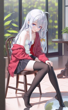 masterpiece,best quality,high quality,loli,(artist:ningen_mame:0.9),(artist:sho_(sho_lwlw):0.9),(artist:rhasta:0.9),(artist:wlop:0.7),(artist:ke-ta:0.6),(fkey:0.5),(tianliang duohe fangdongye:0.5),(hiten \(hitenkei\):0.6),loli, elaina (majo no tabitabi), 1girl, ahoge, thighhighs, solo, long hair, black thighhighs, sitting, chair, blurry, off shoulder, red jacket, blurry background, skirt, rain, blue eyes, ribbon, grey hair, shirt, black skirt, hair between eyes, open clothes, hair ribbon, jacket, bow, yellow bow, plant, collarbone, open jacket, white shirt, smile, on chair, miniskirt, no shoes, zettai ryouiki, depth of field, long sleeves, spaghetti strap, closed mouth, hair bow, tongue out, full body, purple ribbon, table, tongue, potted plant, reflection, bare shoulders, sidelocks, pleated skirt, yellow ribbon, crossed bangs, open cardigan, sleeveless shirt, reflective water, small breasts, outdoors, hand on own knee, breasts, looking to the side