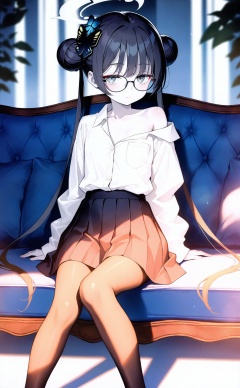 masterpiece,best quality,high quality,loli,white_skin,pale_skin,fair_skin,1girl,solo,butterfly hair ornament,halo,double bun,kisaki (blue archive),hair bun,skirt,black hair,glasses,shirt,hair ornament,white shirt,long hair,twintails,round eyewear,looking at viewer,pantyhose,black skirt,long sleeves,alternate costume,sitting,bespectacled,pleated skirt,closed mouth,single bare shoulder,off shoulder,shirt tucked in,grey eyes,grey halo,black pantyhose,collarbone,black-framed eyewear,couch,collared shirt,blue eyes,arm support,white halo,very long hair,on couch,official art,depth of field,high contrast,colorful,detailed light,light leaks,beautiful detailed glow,best shadow,shiny skin,cinematic lighting,ray tracing,best quality,amazing quality,very aesthetic,absurdres,beast quality,masterpiece,ultra detailed,newest,8K,HDR,