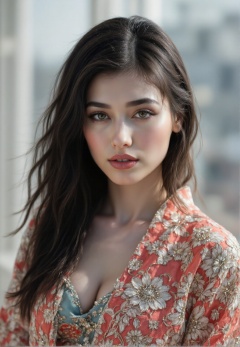 and her expression is contemplative and slightly melancholic. She has a delicate, fair complexion and long, The image is a high-resolution photograph featuring a close-up portrait of a woman with a fair complexion and long, platinum black hair flowing freely, shimmering silver embroidery and a teal underlay., This photograph features a young woman. She is depicted in a natural, vibrant red dress.,HARUKA,