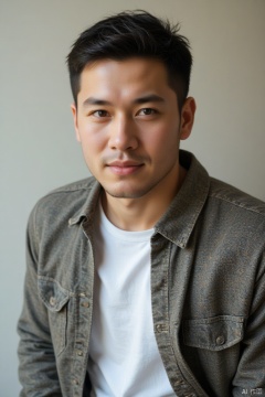 A asian man is wearing a casual jacket and a white shirt. He has very short hair. He is handsome and has a mature temperament,middle aged man,