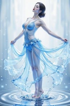 This is a highly detailed, digital artwork depicting a woman in a flowing dress made entirely of water. The woman's body is gracefully arched, with her arms extended outward and upwards, creating a sense of fluid motion. Her dress, which appears to be made of water droplets, billows and swirls around her, giving the illusion of a dynamic, ethereal dance. The dress is translucent, allowing glimpses of the woman's form beneath, which is slender and athletic.The background is a gradient of soft blues and whites, creating a cool, serene atmosphere that enhances the watery theme. The water droplets in the dress sparkle and glisten, catching the light and adding a sense of depth and texture. The droplets are depicted with a high level of realism, capturing the refractive quality of water and the way it reflects light.The overall style is highly detailed and photorealistic, with a focus on capturing the dynamic movement and fluidity of the water. The artwork evokes a sense of grace and beauty, with the woman's pose and the flowing dress creating a harmonious, almost otherworldly scene. The image is a blend of realism and fantasy, making it both captivating and visually stunning.