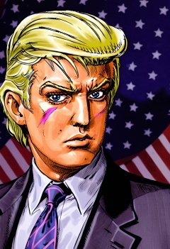 donald trump with serious face expression in suit, upper body ,detailed face, USA flag in background , by araki hirohiko,  <lora:araki_hirohiko-000016:0.7> <lora:add-detail-xl:0.4>