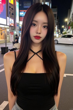 Captured at eye-level, a close-up shot of a young Asian woman stands on a city street at night. She is wearing a black halter top, a black chain necklace, and a pair of denim jeans. Her hair is long and cascades over her shoulders, framing her face. Her eyes are a deep brown, and her lips are a vibrant red, adding a pop of color to her lips. The backdrop of the scene is a cityscape, with a white car parked on the right side of the street.