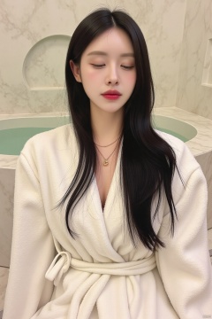 a woman with long black hair, wearing a white bathrobe, is seated in front of a bathtub. The bathtub is surrounded by a marble wall, adorned with a circular design. The woman's eyes are closed, and her lips are painted a deep red. She has a necklace around her neck, adding a touch of color to her outfit.