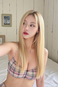 a woman with long, straight blonde hair, wearing a plaid bikini top and a silver necklace with a star charm hangs from her neck. She is striking a pose, with her left arm stretched out to the side. Her eyes are squinted, and her lips are painted a soft pink. Her hair is cascading down her right shoulder, adding a touch of warmth to her face. The backdrop is a rustic white wall, with two framed pictures on the left side of the wall. A bed is to the right of the woman, with a white sheet covering it.