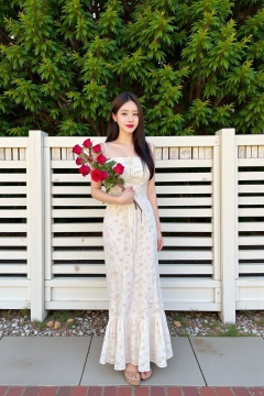 Captured at eye-level, a medium-sized Asian woman stands on a paved sidewalk, dressed in a white sleeveless dress adorned with a floral pattern, holding a bouquet of red roses in her left hand. The woman's hair is styled in a sleek bob, with bangs and a slight smile on her face. She is standing in front of a white picket fence, which is adorned with wooden slats. The fence is set against a backdrop of lush green foliage, adding a touch of nature to the scene.