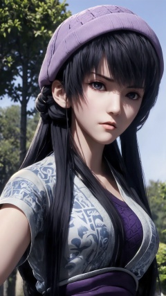 The image is a close-up portrait of a young woman with dark hair and a purple hat. She is wearing a black and gold outfit with intricate patterns and designs. The woman is holding a sword in her right hand and appears to be ready for battle. She has a serious expression on her face and is looking directly at the camera. The background is blurred,but it seems to be an outdoor setting with trees and a blue sky. The overall mood of the image is intense and dramatic.,<lora:1.5端木蓉(6):0.8>,