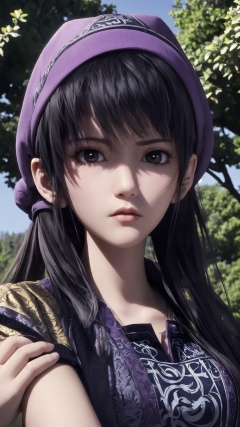 The image is a close-up portrait of a young woman with dark hair and a purple hat. She is wearing a black and gold outfit with intricate patterns and designs. The woman is holding a sword in her right hand and appears to be ready for battle. She has a serious expression on her face and is looking directly at the camera. The background is blurred,but it seems to be an outdoor setting with trees and a blue sky. The overall mood of the image is intense and dramatic.,<lora:1.5端木蓉(7):0.8>,
