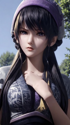 The image is a close-up portrait of a young woman with dark hair and a purple hat. She is wearing a black and gold outfit with intricate patterns and designs. The woman is holding a sword in her right hand and appears to be ready for battle. She has a serious expression on her face and is looking directly at the camera. The background is blurred,but it seems to be an outdoor setting with trees and a blue sky. The overall mood of the image is intense and dramatic.,<lora:1.5端木蓉(2):0.8>,