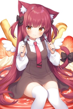1girl, tail, animal_ears, cat_ears, long_hair, solo, cat_tail, dress, shirt, cat_girl, looking_at_viewer, long_sleeves, white_shirt, thighhighs, fork, two_side_up, necktie, red_necktie, bow, tail_ornament, food, animal_ear_fluff, white_background, white_thighhighs, blush, collared_shirt, sleeveless, sleeveless_dress, very_long_hair, red_hair, puffy_sleeves, red_eyes, wings, tail_bow, brown_eyes, smile, simple_background, sitting, brown_dress, brown_hair