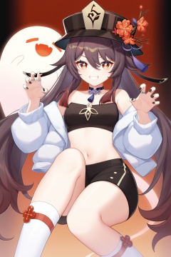 1girl, hu_tao_\(genshin_impact\), boo_tao_\(genshin_impact\), smile, shorts, crop_top, looking_at_viewer, brown_hair, midriff, long_hair, black_shorts, black_nails, solo, choker, navel, black_headwear, flower, long_sleeves, shirt, grin, socks, thighs, symbol-shaped_pupils, hat, red_eyes, stomach, jacket, black_shirt, flower-shaped_pupils, white_socks, ring, jewelry, open_clothes, claw_pose, short_shorts, open_jacket, off_shoulder, sleeveless_shirt, multiple_rings, black_choker, ghost, twintails, sleeveless, plum_blossoms, nail_polish, bare_shoulders, very_long_hair, hands_up, white_jacket