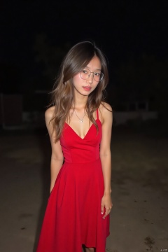 A 18-year-old woman,at night,bright ,red dress ,white skin,wavy hair,cxy,sideways,white light on face,wearing glasses,Thin face, melon face, pointy face,smooth skin,full_body,bare long legs,nine-headed body,wearing broad shoes,smile
