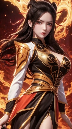 The image is a digital illustration of a female warrior. She is wearing a red and gold armor with intricate designs and patterns. The armor has a high neckline and long sleeves,and she is holding a sword in her right hand. The woman has long dark hair that is styled in loose waves and is wearing multiple horns on her head. She has a fierce expression on her face and is standing in front of a fiery background. The overall color scheme of the image is red,gold,and black.,<lora:1.5焰灵姬(4):0.8>,
