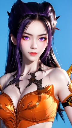 The image is a digital portrait of a young woman with long dark hair. She has a serious expression on her face and is looking directly at the camera. Her hair is styled in a high ponytail with multiple spikes sticking out of it. She is wearing a white and orange outfit with a dragon design on the chest. The background is a dark blue color with a hint of purple. The overall mood of the image is intense and dramatic...,<lora:pony焰-000008:0.8>,
