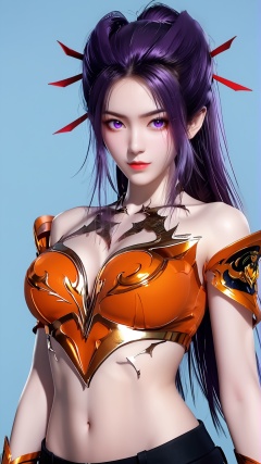 The image is a digital portrait of a young woman with long dark hair. She has a serious expression on her face and is looking directly at the camera. Her hair is styled in a high ponytail with multiple spikes sticking out of it. She is wearing a white and orange outfit with a dragon design on the chest. The background is a dark blue color with a hint of purple. The overall mood of the image is intense and dramatic...,<lora:pony焰-000009:0.8>,