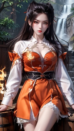 The image is a digital illustration of a female character sitting on a wooden barrel. She is wearing a black and orange outfit with intricate patterns and designs. The outfit has a high neckline and long sleeves, and the skirt is long and flowing. The woman has long dark hair that is styled in loose waves and is holding a yellow flame in her right hand. She has a serious expression on her face and is looking directly at the camera. The background is dark and eerie, with a stone wall on the left side of the image. The overall mood of the illustration is mysterious and powerful..,<lora:pony焰:0.8>,