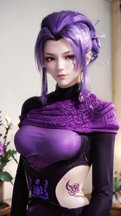 The image is a digital illustration of a young woman with purple hair. She is standing in a room with a white wall and a plant in the background. The woman is wearing a purple and black outfit with a high neckline and long sleeves. She has a large purple scarf draped over her shoulders and a tattoo on her chest. Her hair is styled in a sleek, straight look and she is looking off to the side with a serious expression on her face. The overall mood of the image is dark and mysterious..,<lora:pony紫女:0.8>,