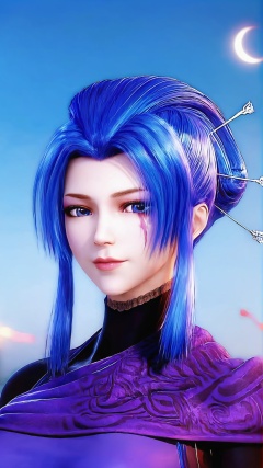 The image is a close-up portrait of a young woman with blue hair. She has a serious expression on her face and is looking directly at the camera. Her hair is styled in a high ponytail with multiple strands of blue hair framing her face. She is wearing a purple outfit with intricate patterns and designs on it. The background is a blue sky with white clouds and a crescent moon. The overall mood of the image is dark and mysterious..,<lora:pony紫女:0.8>,