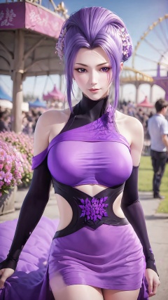 The image is a digital illustration of a young woman with long purple hair styled in a high ponytail. She is standing in front of a carnival ride with pink flowers and a ferris wheel in the background. The woman is wearing a purple dress with a cut-out design on the front and long sleeves. She has a serious expression on her face and is looking directly at the camera. The overall mood of the image is playful and whimsical.<lora:pony紫女:0.8>,