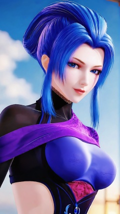 The image is a digital portrait of a young woman with blue hair. She has a serious expression on her face and is looking directly at the camera. Her hair is styled in a high ponytail with multiple strands of blue hair framing her face. She is wearing a purple and black outfit with a high collar and a choker necklace. The background is a blue sky with white clouds and a crescent moon. The overall mood of the image is dark and mysterious.,<lora:pony紫女:0.8>,