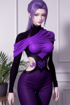The image is a digital illustration of a young woman with purple hair. She is standing in a room with a white wall and a plant in the background. The woman is wearing a purple and black outfit with a high neckline and long sleeves. She has a large purple scarf draped over her shoulders and a tattoo on her chest. Her hair is styled in a sleek, straight look and she is looking off to the side with a serious expression on her face. The overall mood of the image is dark and mysterious.
