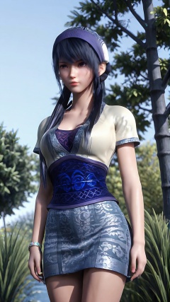 The image is a 3D rendering of a female character from a video game. She is standing in a garden with trees and bushes in the background. The character is wearing a blue and white outfit with intricate patterns and designs. The outfit has a high neckline and short sleeves, and the skirt is flared at the bottom. She has long, dark hair that is styled in loose waves and falls over her shoulders.The character is holding a scroll in her left hand and is looking off to the side with a serious expression on her face. She appears to be in a contemplative pose, as if she is deep in thought. The overall mood of the image is peaceful and serene.,<lora:pony端木蓉:0.8>,