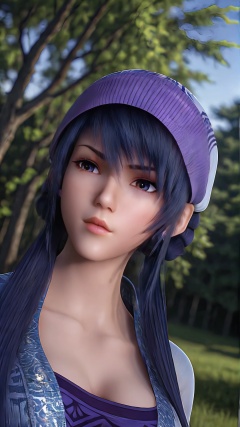 The image is a close-up portrait of a young woman's face. She has a serious expression with her eyes looking directly at the camera. Her hair is styled in a short, straight cut with bangs that fall over her shoulders. She is wearing a purple baseball cap with a white brim and a black jacket with a blue and gold pattern. The background is blurred, but it appears to be an outdoor setting with trees and a building visible in the distance. The overall mood of the image is dark and mysterious.,<lora:pony端木蓉:0.8>,