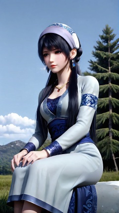 The image is a digital illustration of a young woman sitting in a snowy landscape. She is wearing a traditional Chinese dress with a red and black color scheme and a black fur stole draped over her shoulders. The dress has a high neckline and long sleeves, and she is also wearing a gold necklace and earrings. The woman has long black hair that is styled in loose waves and cascades over her head. She has a crown on her head with intricate designs and jewels. The background is a snowy forest with bare trees and a blue sky. The overall mood of the image is peaceful and serene.<lora:pony端木蓉:0.8>,