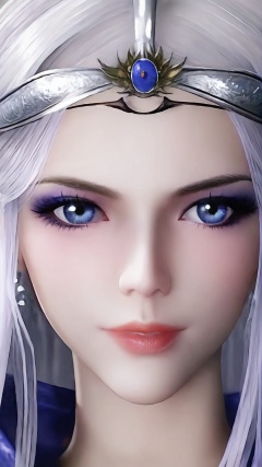 The image is a close-up portrait of a young woman's face. She has white hair that is styled in loose waves and falls over her shoulders. Her eyes are a deep blue color and her eyebrows are a lighter shade of blue. She is wearing a silver headpiece with a large, ornate design on top. The headpiece appears to be made of metal and has a pointed tip. The woman's expression is serious and she is looking directly at the camera. The background is blurred, so the focus is on her face.<lora:pony雪女:0.8>,