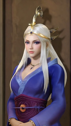 The image is a portrait of a young woman with long white hair and a crown on her head. She is wearing a blue dress with a purple belt and a gold necklace. The dress has a high neckline and long sleeves. The woman is holding a purple book in her hands and is standing in front of a stone wall with intricate carvings. She has a serious expression on her face and is looking directly at the camera. The overall mood of the image is mystical and regal.,<lora:pony雪女:0.8>,