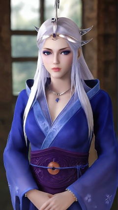 The image is a close-up portrait of a young woman with long white hair. She is wearing a blue traditional Chinese outfit with a high neckline and long sleeves. The outfit is made of a blue fabric with intricate patterns and designs. The woman is also wearing a silver headpiece with a large headpiece that resembles a dragon's head. The headpiece is made up of multiple spikes and spikes that are attached to the woman's head with a silver chain. She has a serious expression on her face and is looking directly at the camera. The background is blurred, but it appears to be an indoor setting with a stone wall and a window.,<lora:pony雪女:0.8>,