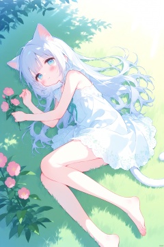 b205,1girl solo long hair white hair cat ears cat tail blue eyes lying on grass white dress holding flower smile blush bright sunlight green field soft focus cat girl relaxed pose outdoors