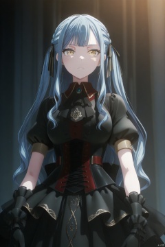 togawa sakiko,long hair,bangs,ribbon,hair ribbon,black ribbon,two side up,blue hair,grey hair,sidelocks,blunt bangs,yellow eyes