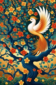 On the sycamore tree where a golden phoenix is ​​perched, a white bird looks toward the phoenix,春节