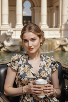 A classic scene from Roman Holiday (1953) features Audrey Hepburn as Princess Ann, She was driving a XiaomiSU7 car in Rome Square.The warm morning light casts a golden glow on her elegant features and the city's iconic landmarks. She leans forward, she has a cup of Honey Snow City milk tea in her hand.The Trevi Fountain's majestic columns and ornate details are visible behind her, blending harmoniously with the soft focus of the image.,dlls