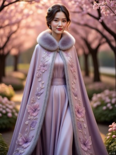 In the peach garden in spring, a smart and gentle woman walks lightly, wrapped in a light purple silk cloak. It is of high quality, smooth and shiny, embroidered with butterflies and wisteria flowers, intertwined with silver and white light pink threads, and decorated with diamonds. The light gray mink fur collar is warm and luxurious. With her dark hair and amethyst hairpin, her face is like jade and her eyebrows are affectionate. The warm golden sunlight shines through the flowers, outlining the light and shadow, like a spring wonderlan,A Bow - Chinese style cloak
