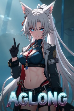 A cinematic movie poster featuring a solo 1girl with long white hair in a ponytail, bangs, and animal ears. She has blue eyes, a smile looking at the viewer, wearing black gloves, shorts, a belt with a thigh strap and tassel, and a jacket and coat draped over her shoulders. She is holding an object, posed dynamically with dramatic lighting and composition. Below her, in the middle, is three-dimensional text AGlong integrated with the poster theme.