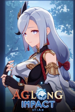 1girl, solo, standing, very long white and grey braided hair with a braided ponytail, hair over one eye, bangs, blue eyes, looking at viewer, closed mouth, hair ornament, black gloves, partially fingerless gloves, holding jewelry, shoulder cutout, tassel earrings, tassel, Shenhe (Genshin Impact) style, movie poster, three-dimensional text AGlong in the middle below, cinematic lighting, dynamic composition, detailed background with poster theme, high contrast, sharp focus, dramatic atmosphere.