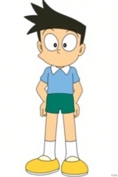 xiaofu, white socks, yellow shorts,black hair,spiky black hair, green shorts, blue shirt, yellow shoes, large eyes,