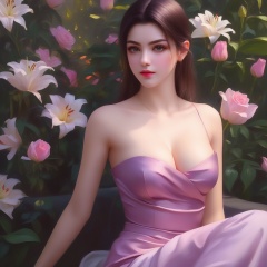 <lora:850-DA-XL-斗破苍穹-美杜莎-红色睡衣:0.8>, (,1girl, ,best quality, ),,  ,ultra detailed 8k cg,ultra realistic 8k cg,1girl, solo,(bare shoulders:0.85),(masterpiece, best quality),((oil painting style)),sexy young lady,(beautiful face and eyes),(upper body:1.5),(whole body:1.05),(single person:1.2),surrounded by flowers, (lily), roses, floret, vegetation, white, purple, purplish pink,Impressionism,colorful,(Breast size:1.3),(cleavage),, butterfly,(sit),