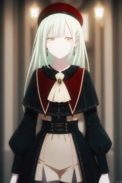 long sleeves,hat,dress,jewelry,pantyhose,earrings,ascot,beret,red footwear,red headwear,