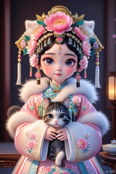 A cute little girl with large expressive eyes, delicate and fair porcelain-like skin, a focused gaze, and a round, adorable face, standing in a side profile pose, dressed in traditional Qing Dynasty attire featuring pink, blue, and white tones, adorned with exquisite floral embroidery, white fur trim at the collar and cuffs, wearing a black qipao headdress decorated with large pink and red flowers, gold and blue jewels, and tassels hanging on both sides, holding a playful cat, soft lighting creating a tranquil and focused atmosphere, blending classical Chinese culture with Qing Dynasty palace aesthetics, the composition capturing the girl's serene expression and the intricate details of her attire, set against a harmonious background.