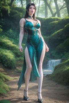 1girl, solo, long hair, breasts, black hair, dress,green dress,long legs,