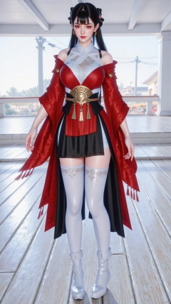 1girl,solo,long hair,black hair,hair ornament,hair rings,hair bun,ponytail,double bun,bangs,thighhighs,jewelry,full body,earrings,boots,white thighhighs,white footwear,skirt,black skirt,hakama,hakama skirt,chinese clothes,dress,red dress,red long sleeves,red wide sleeves,canghaisz