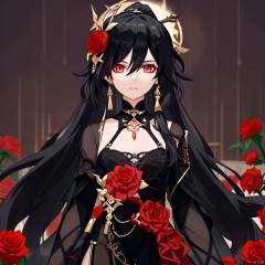 Blood Voivode, long hair, bangs, black hair, hair ornament, red eyes, hair between eyes, flower, hair flower, ponytail, red rose, jewelry, earrings, red flower, rose